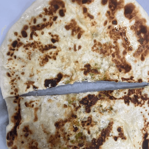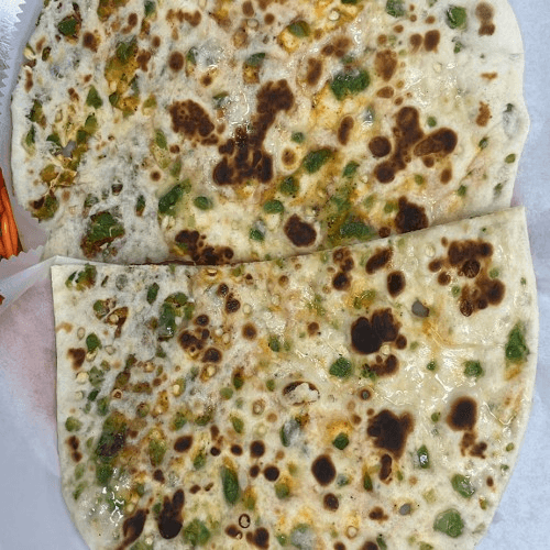 Naan stuffed with paneer (Indian cheese), mozzarella cheese, cream cheese, green and red chilis with homemade spices. Garnished with cilantro (VV spicy)
